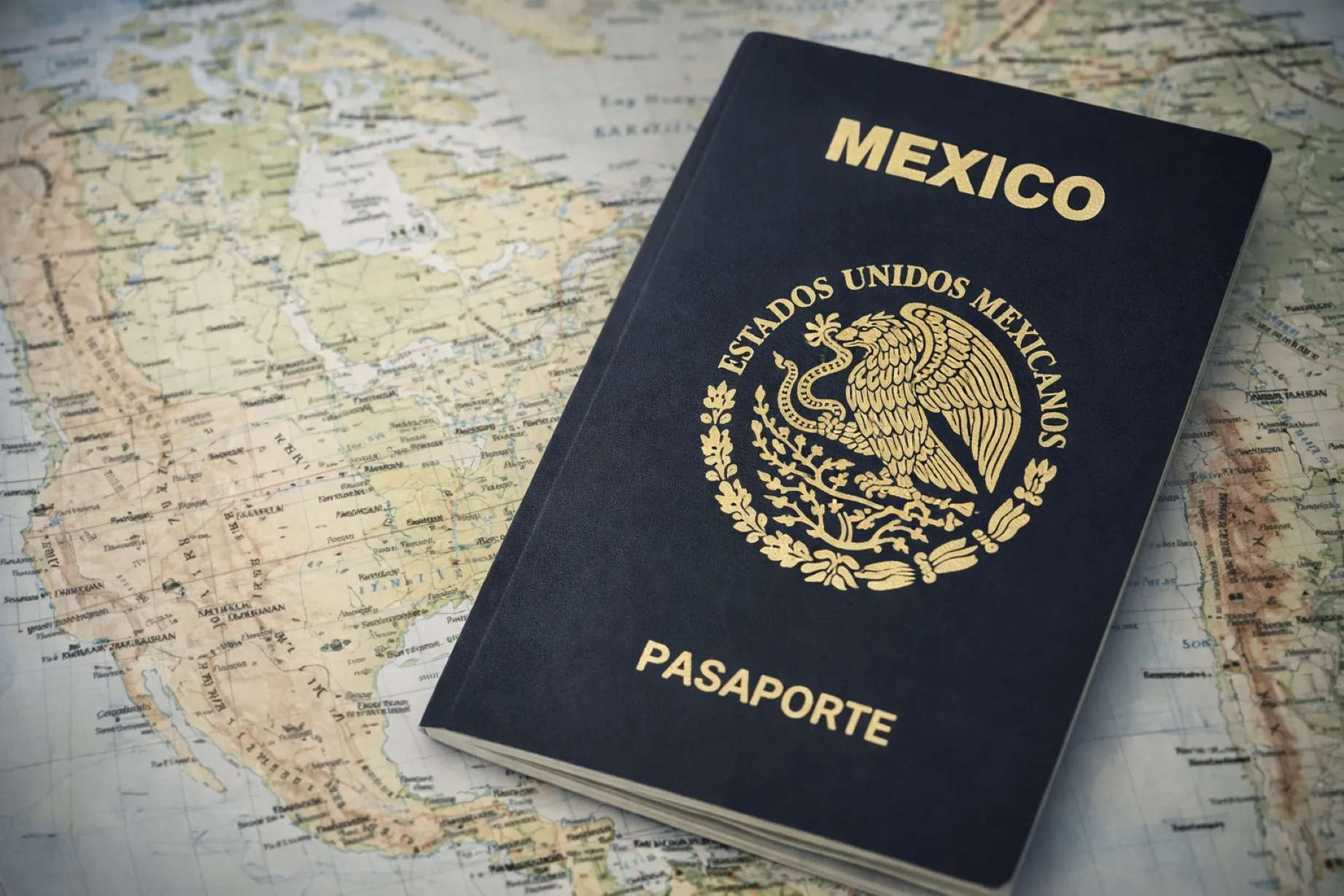 Pasaporte mexicano sobre mapa en trámite sin cita en San Diego