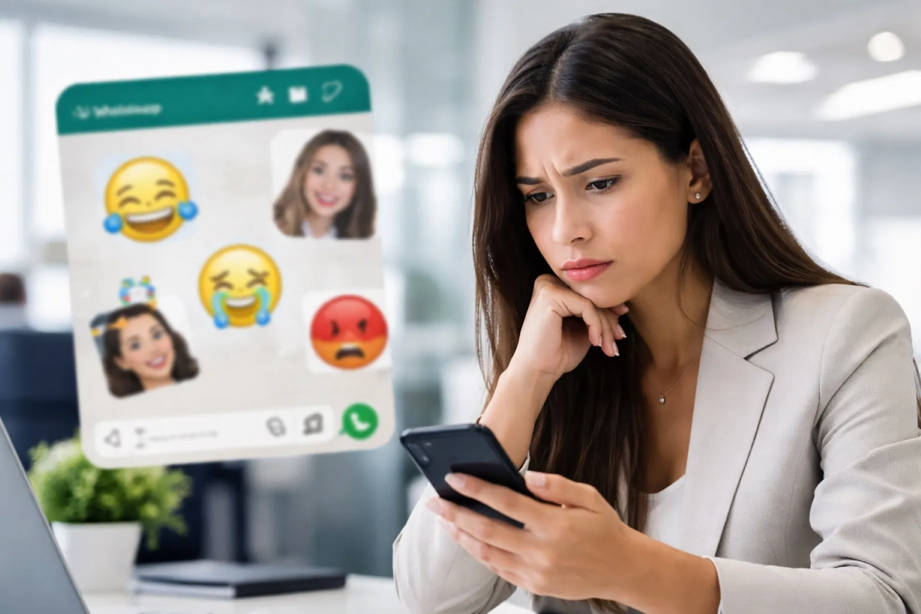 Mujer preocupada revisa stickers ofensivos en WhatsApp