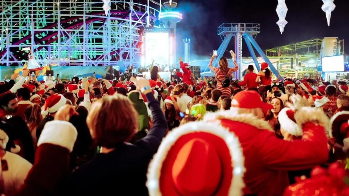 Luces navideñas, decoraciones temáticas y escenarios múltiples marcaron el ambiente del evento organizado por Almost Nakey. SantaCon reunió a miles de asistentes que recorrieron el parque entre presentaciones simultáneas de música electrónica, hip hop y sets experimentales, en un formato que combinó fiesta abierta y experiencia urbana.